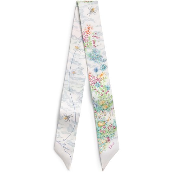 Genieße den Dior Charming Garden Mitzah-Schal, ein faszinierendes Accessoire mit einem mehrfarbigen Druck auf weißem Hintergrund. Das Dior-Logo verleiht dem eleganten Design eine besondere Note, während die spitzen Enden für Raffinesse sorgen.