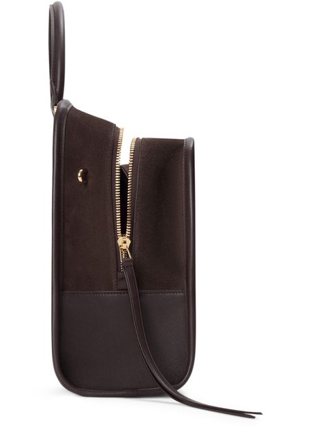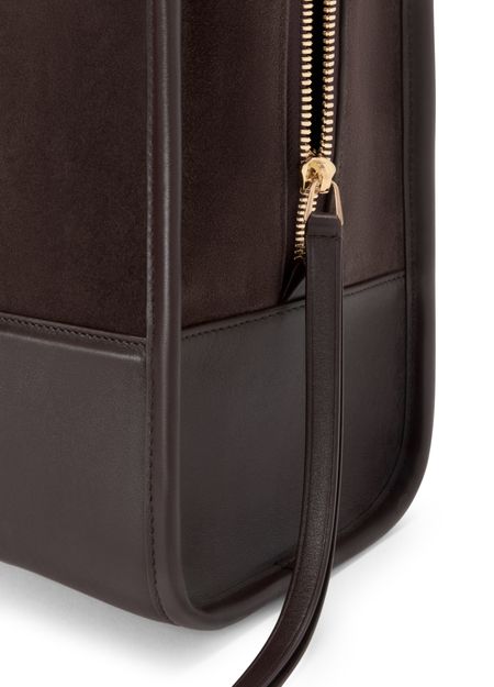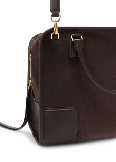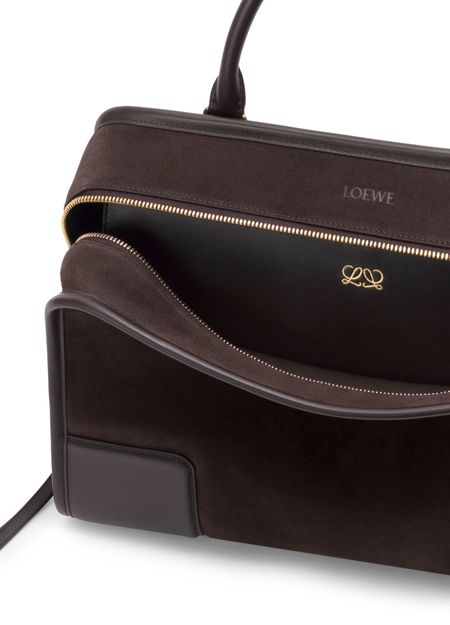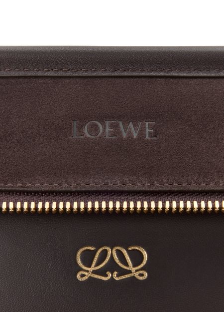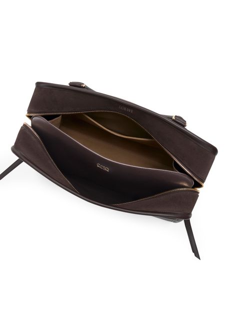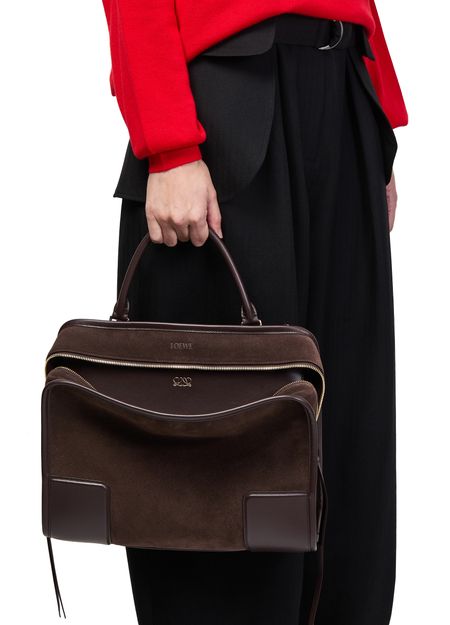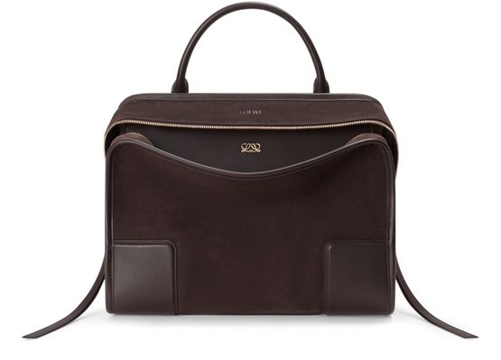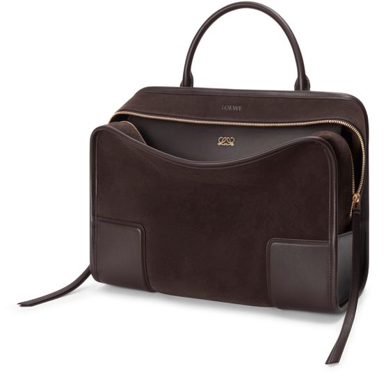Genieße die große Tasche Amazona 180 von Loewe, gefertigt aus zwei Materialien mit doppelgriffen und dünnem, abnehmbarem trageriemen. Goldfarbene Details, das Logo auf der Vorderseite und eine praktische fronttasche verbinden stilvolle Raffinesse mit funktionalem Design.