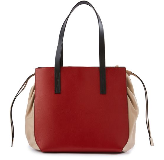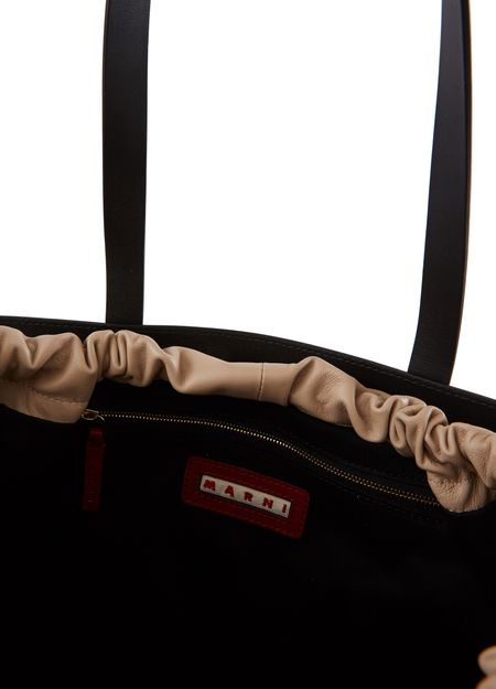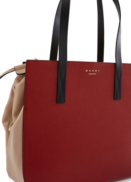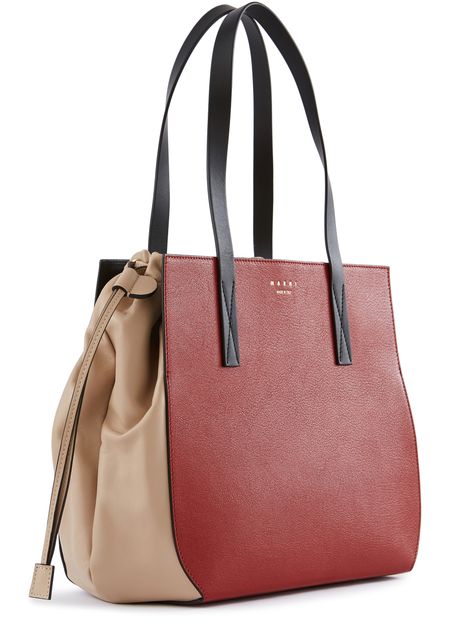 Die Handtasche Gusset von Marni aus Kalbsleder besticht durch ihre klaren Linien. Die Vorder- und Rückseite, wie zwei eckige Lederstücke, beherbergen eine weitere, geschmeidigere Ledertasche, die durch eine Verbindung gespannt wird und die man an den Seiten erahnen kann. Ihre beiden langen, kontrastierenden Griffe umrahmen das geprägte goldene Logo des italienischen Modehauses auf der Vorderseite.