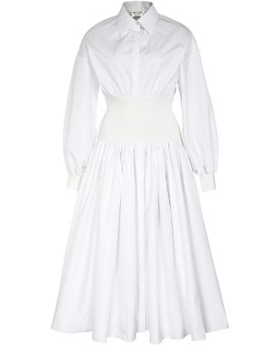 Alexander McQueen unterstreicht die Taille dieses Hemdkleides Hybrid mit einem sehr breiten, elastischen Einsatz, dessen Textur einen Kontrast zu den traditionelleren Teilen des Kleidungsstücks bildet.