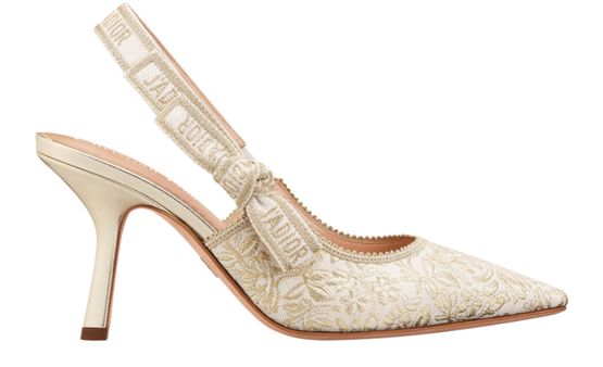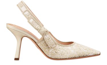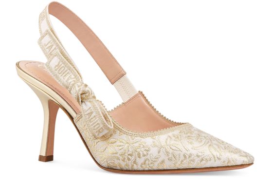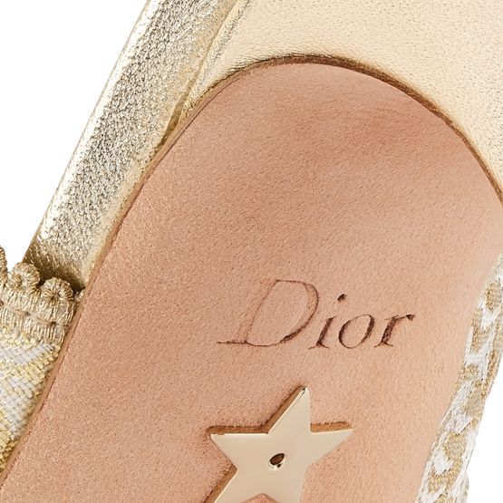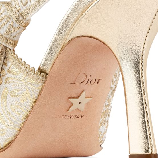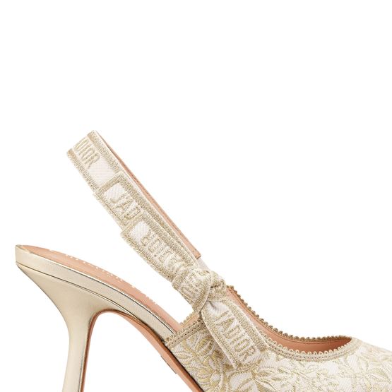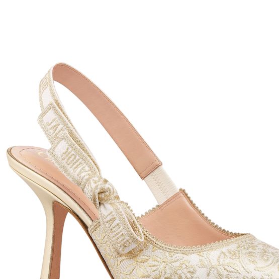 Erlebe Dior's J'Adior Slingback-Pumps mit zweifarbigem J'Adior besticktem Baumwollband und flacher Schleife. Das Design besticht durch einen tief ausgeschnittenen Schaft mit gezacktem Rand und eine Kalbsledersohle, verziert mit einem Stern, dem Glückssymbol von Christian Dior.