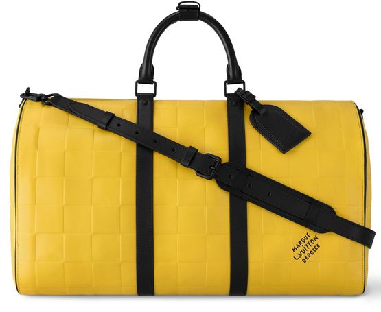 Men's Artistic Director Pharrell Williams präsentiert die Keepall 50 mit Schulterriemen in dem von ihm entwickelten leuchtend gelben Damier Scuba Kalbsleder. Dieses geschmeidige Leder zeichnet sich durch ein geprägtes Damier-Motiv und eine Schicht aus Neopren auf der Rückseite aus. Diese Details verleihen der Tasche eine einzigartige Haptik. Das schwarze Leder der Tragegriffe an der Oberseite und der seitlichen Bänder betont die sportive, maritime Wirkung des...