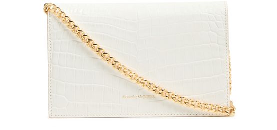 Admira die kleine Crossbody-Tasche Skull von Alexander McQueen, ein Inbegriff von Eleganz aus leder mit krokodilprägung. Mit gold-finish und logo auf vorderseite bietet diese minitasche einen stilvollen kettengurt und ein funktionales Design mit klappenverschluss, einzelnes fach und kartenschlitze im inneren.