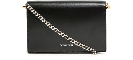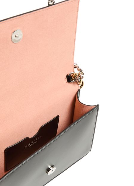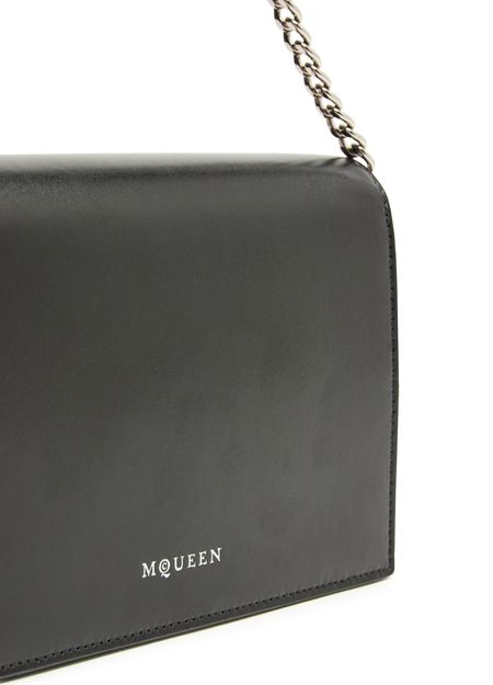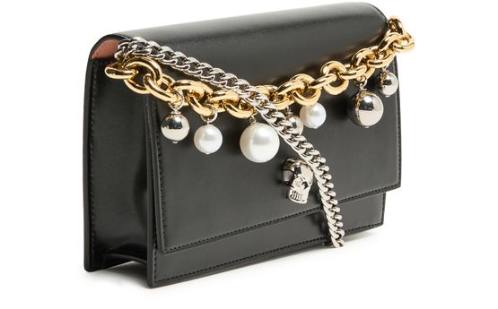 Genieße die kleine Tasche Skull von Alexander McQueen, gefertigt aus glattem Leder mit dekorativem, abnehmbarem Kettenriemen. Sichtbare Steppnähte, ein Logo auf der Vorderseite und ein Druckknopf-Verschluss vereinen stilvolle Details mit praktischer Raffinesse.