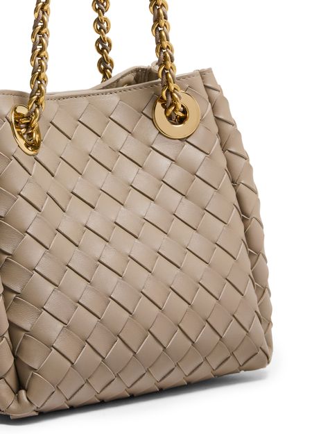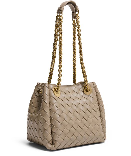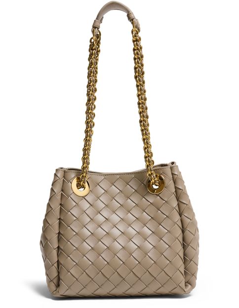 Beschreibung : magnetschließe, einzelnes fach, gold-finish, doppelgriffe, sichtbare steppnähte, zum tragen in der hand, zum tragen über der schulter, dekorativer kettenriemen.