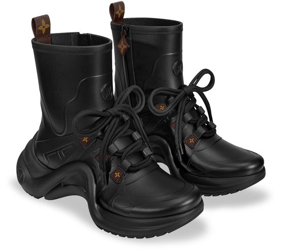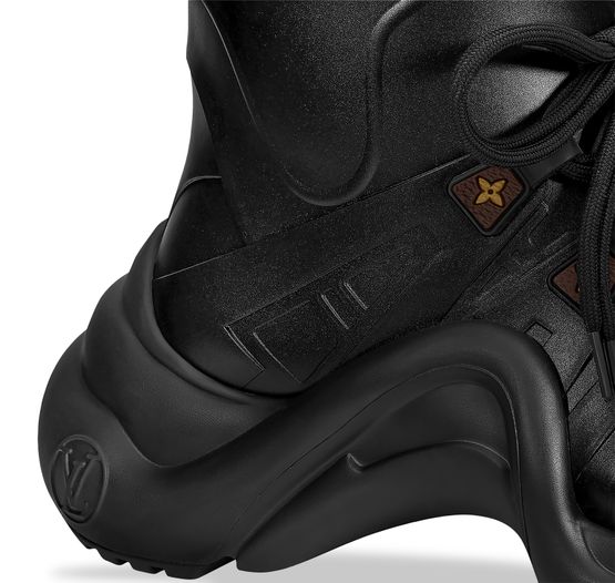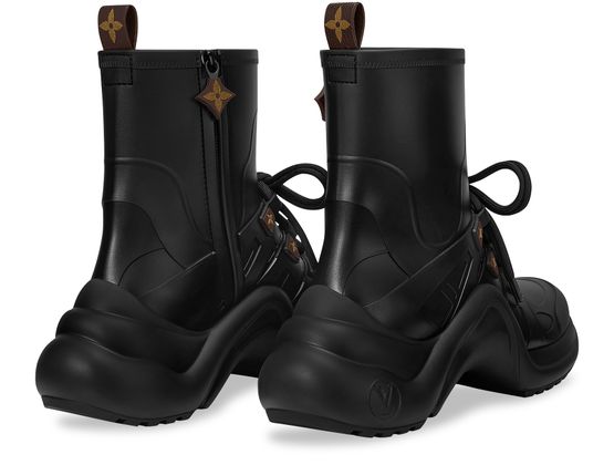Diese für Regentage perfekt geeignete Neuinterpretation des ikonischen LV Archlight Sneakerboots ist aus wasserfestem, mattem Gummi gefertigt. Er präsentiert sich mit den wesentlichen Details des ursprünglichen Designs von Nicolas Ghesquière, wie der wellenförmigen Außensohle mit der LV Circle Signatur. Die Schlaufe an der Ferse und der Reißverschlussschieber sind in der Optik von Monogram Canvas gehalten.