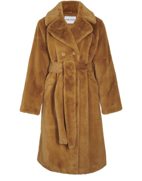 Der Mantel Faustine ist ein langes und bequemes Modell, das von dem Modehaus Stand angeboten wird. Er wird mit einem breiten, flauschigen Gürtel an der Taille gebunden.