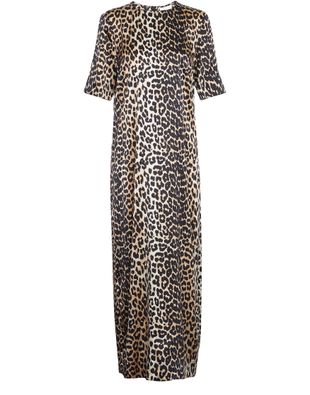 Dieses Maxikleid aus Seide für die Frau der Marke Ganni ist aus Seide gefertigt. Es hat einen Leopardenprint auf seiner gesamten Oberfläche und besitzt einen runden Ausschnitt sowie kurze Ärmel.