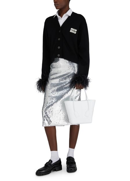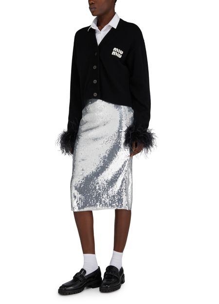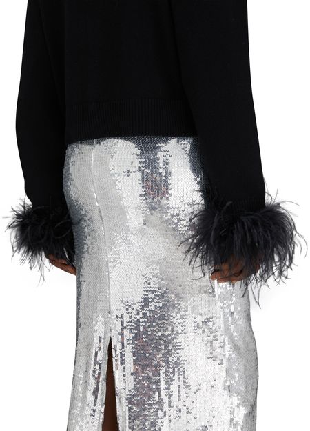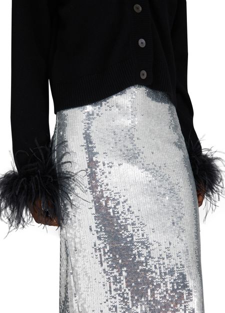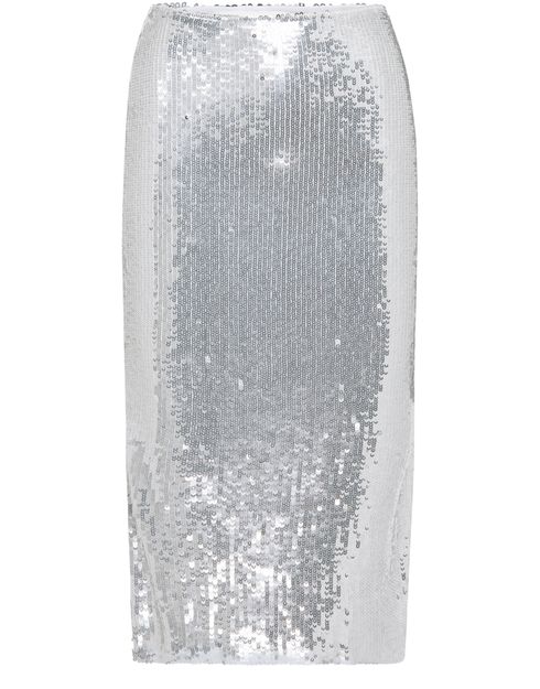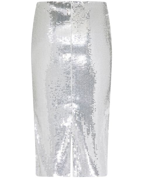 • Beschreibung : Bleistiftrock, midilänge, vollständig mit Pailletten bestickt, silber-Finish.