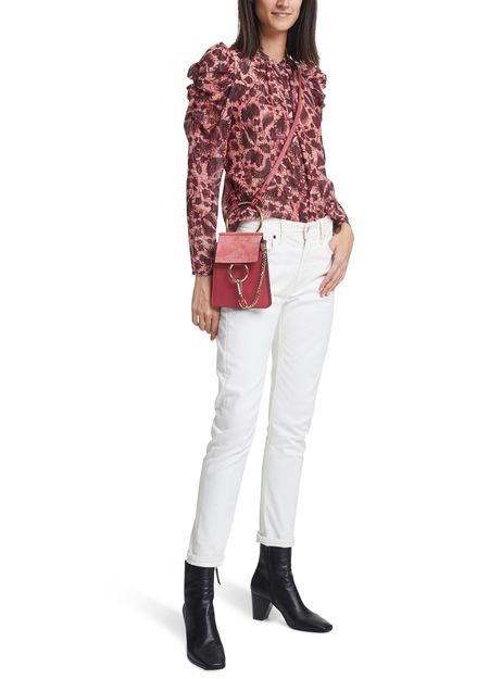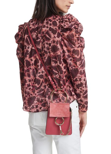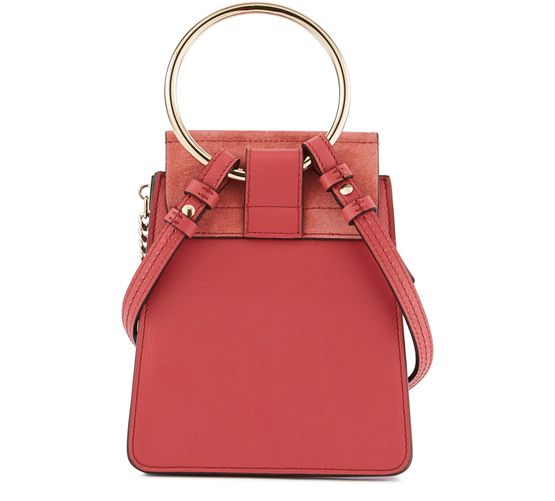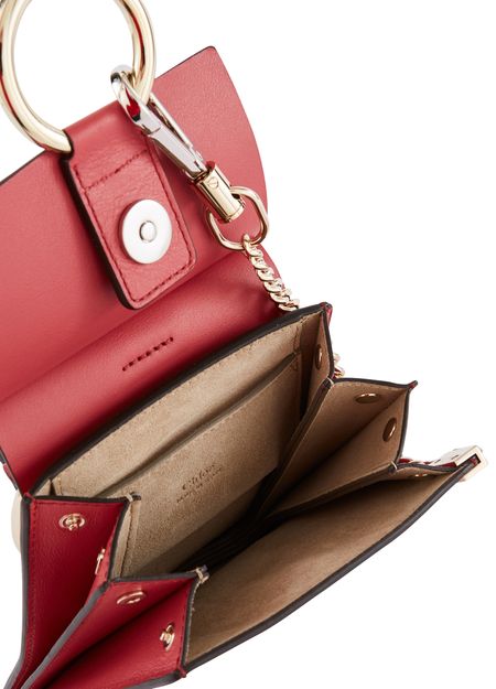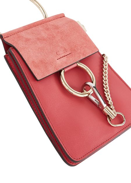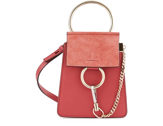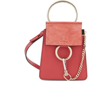 Die Mini-Armbandtasche Faye feiert ihr Debüt in der Chloé-Familie. Man erkennt den emblematischen Verschluss des Hauses, der mit einem überdimensionalen Ring und einer charakteristischen Hängekette verziert ist.