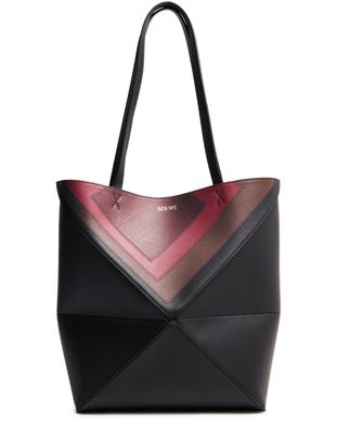 Entdecke Loewes geometrische cabas-tasche, gefertigt aus glattem Leder mit doppelgriffen. Diese Schultertasche bietet ein einzelnes Fach und sichtbare Steppnähte, verziert mit einem Logo auf der Vorderseite in goldfarbenen Buchstaben. Perfekt für alle, die funktionale Eleganz und unverwechselbares Design schätzen.