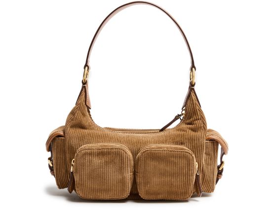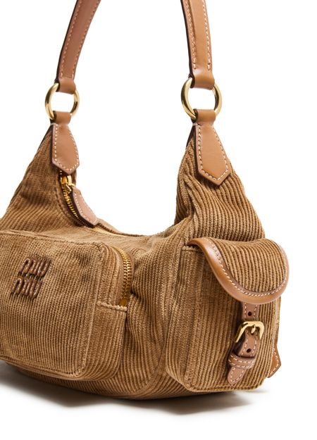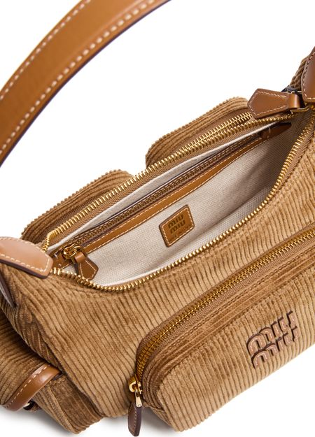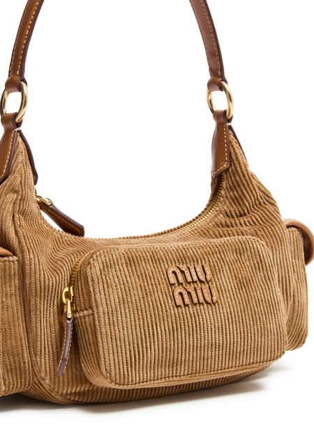 Entdecke die Schultertasche aus Cord von Miu Miu mit gestanztem Logo, goldfarbenen Details und einem einzelnen Griff. Mehrere Reißverschlusstaschen und sichtbare Steppnähte sorgen für einen modernen Look, während das Logo auf der Vorderseite stilvolle Akzente setzt.