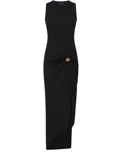 • Beschreibung : ärmellos, etikett mit logo auf der rückseite, rundhalsausschnitt, langes kleid, gold-finish, drapiertes kleid, drapierungsdetail, sichtbar nähte.