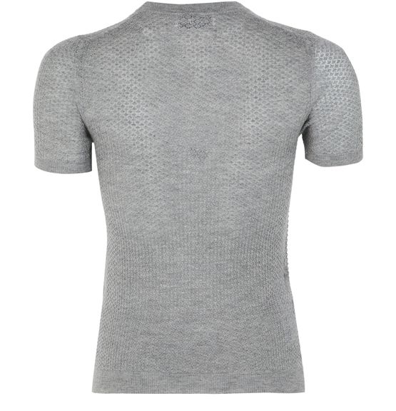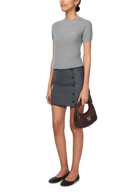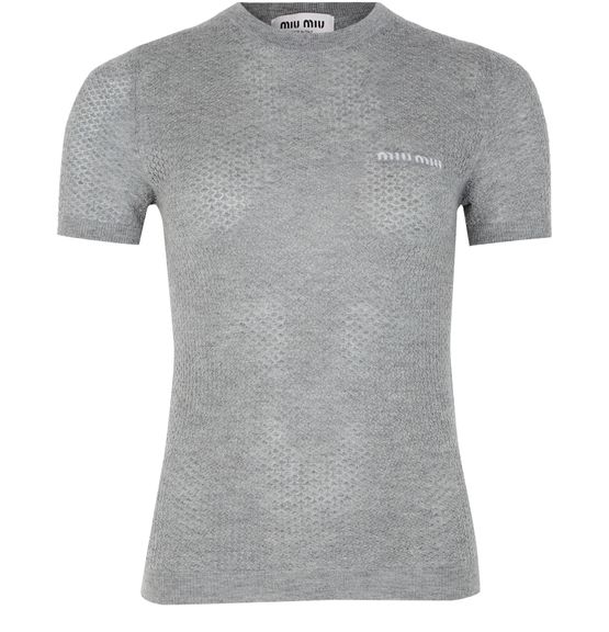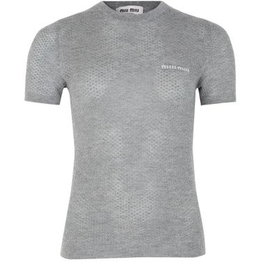 Admira den Miu Miu Rundhalspullover mit aufgesticktem Logo auf der Brust und körperbetontem Schnitt. Dieses kurze Ärmel-Strickoberteil vereint mühelos Eleganz und Komfort, perfekt für lässige oder elegante Looks. Sein klassischer Rundhalsausschnitt macht es zu einem vielseitigen Must-have.