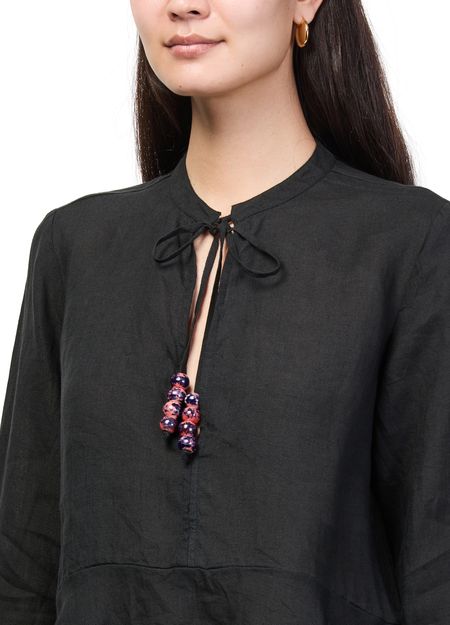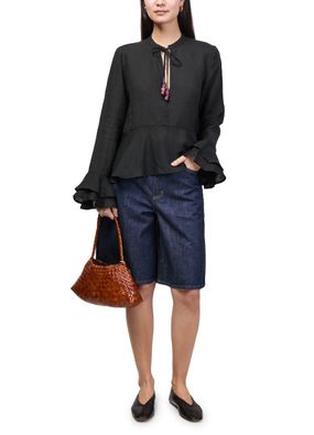 Genieße die Bluse Frigga von Skall Studio – ein stilvolles Oberteil mit rundhalsausschnitt und langen rüschenärmeln. Der verschluss mit schleife verleiht dem Design eine verspielte Note, während der lockere Schnitt vielseitige Stylingmöglichkeiten für moderne Outfits bietet.