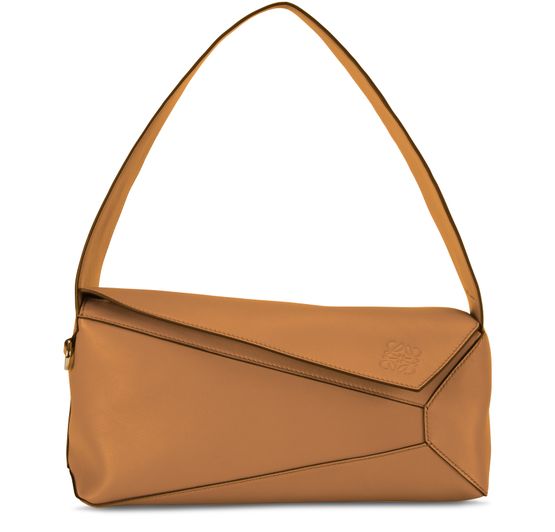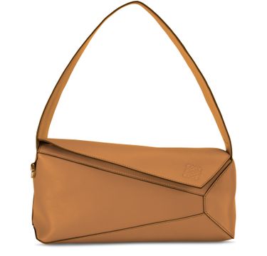 Die berühmte und zeitlose Tasche Hobo Puzzle von Loewe wird in einer eleganten Version aus Glattleder präsentiert. Ihr modernes Design wird durch dezente Vergoldungen veredelt, die ihr eine besondere Raffinesse verleihen.
