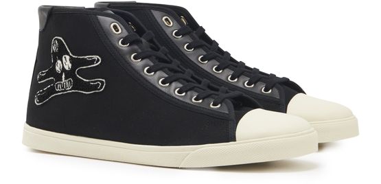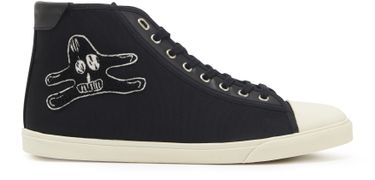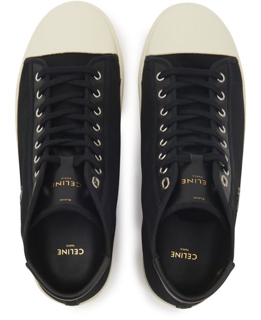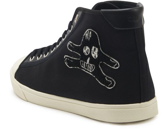 Diese hohen Sneaker Celine Blank sind in Zusammenarbeit mit dem deutschen Maler André Butzer entstanden. Diese Schnürschuhe besitzen eine kontrastierende und abgerundete Zehe. Bei diesem Modell verbindet sich die Geschmeidigkeit des Leinens mit der Noblesse von Kalbsleder. Diese hochgeschlossenen Sneaker werden mit einer von André Butzer entworfenen Figur hervorgehoben, die an der Seite des Fußes angenäht ist.