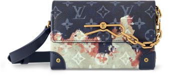 Die Steamer Wearable Geldbörse zeigt für die Frühjahr Sommer 2024 Kollektion ein eindrucksvolles neues Motiv, das von ausgeblichenem Denim inspiriert ist. Ein Muster in hellen Farbtönen vor einem Hintergrund in dunkelblauem Monogram Canvas verweist auf das facettenreiche Licht eines Lagerfeuers — ein Schlüsselthema der Kollektion. Unverkennbare Details wie verstärkte Eckbeschläge und eine Kette im Steamer-Stil sorgen zusätzlich für eine modische und zugleich klassische Note.