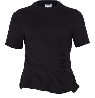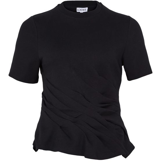 Genieße Loewe's T-Shirt mit Twist, ein modernes Must-Have. Mit seinem Rundhalsausschnitt und den kurzen Ärmeln bietet dieses körperbetonte Top, das an der Taille gerafft ist, eine schmeichelhafte Silhouette. Es ist für einen Crop-Look gestaltet und verleiht jedem Outfit eine zeitgemäße Note.