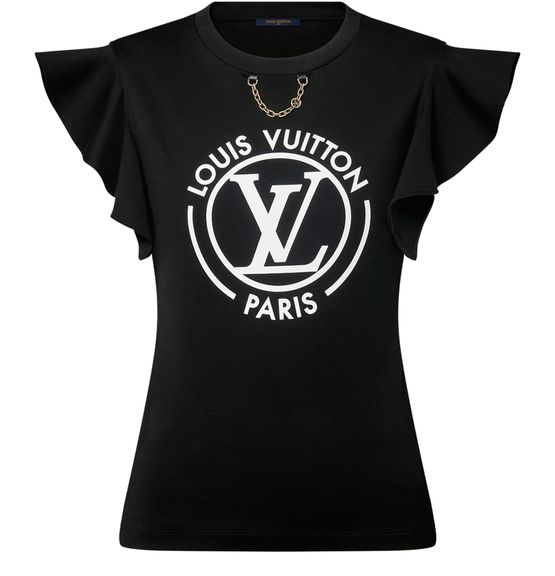 Romantische Volants an den Ärmeln verleihen diesem klassischen T-Shirt aus angenehmem Baumwolljersey modisches, sommerliches Flair. Seine Vorderseite akzentuiert ein großes LV Circle-Motiv, während ein LV Chain-Detail den Ausschnitt mit einer zeitgemäßen Signatur des Hauses Louis Vuitton abrundet.