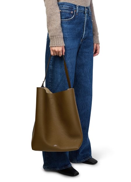 Genieße die Tragetasche aus genarbtem Leder mit Gürtel von Toteme, ausgestattet mit einem einzelnen Griff und sichtbaren Nähten. Das großzügige Innenfach sorgt für Übersicht, während das stilvolle Design moderne Eleganz in deinen Alltag bringt.