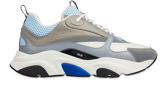 Die 'B22' Sneaker sind eine Retro-Variante der 'Chunky'-Sneaker, die unterschiedliche Materialien und Strukturen wie graues Kalbsleder und technischen für einem athletischen Statement-Look verbindet. Die 'B22' Sneaker sind mit runden Schnürsenkeln, einem Dior Relieflogo auf einer Seite sowie einer dicken, geformten Gummisohle. Sie werden zu einem Anzug kombiniert und sorgen für einen sportlichen Trendlook.