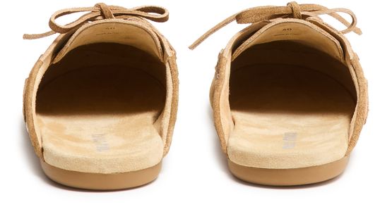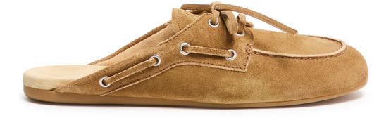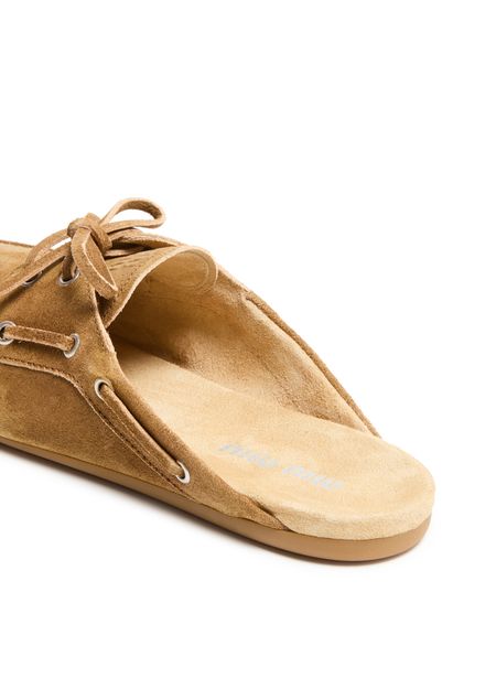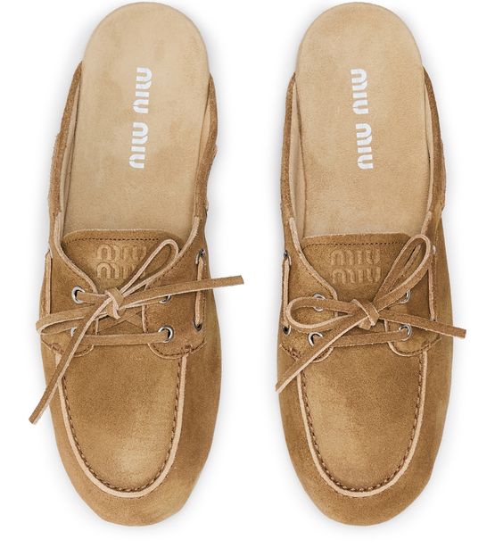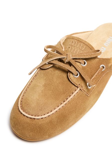 Genieße die Boat-Pantoletten aus Wildleder von Miu Miu mit runder, geschlossener Zehenpartie und flachem Absatz für einen modernen Look. Sichtbare Nähte, steppkanten und das aufgedruckte Logo auf der Zunge unterstreichen das Design, während die Innensohle aus Leder Komfort bietet.