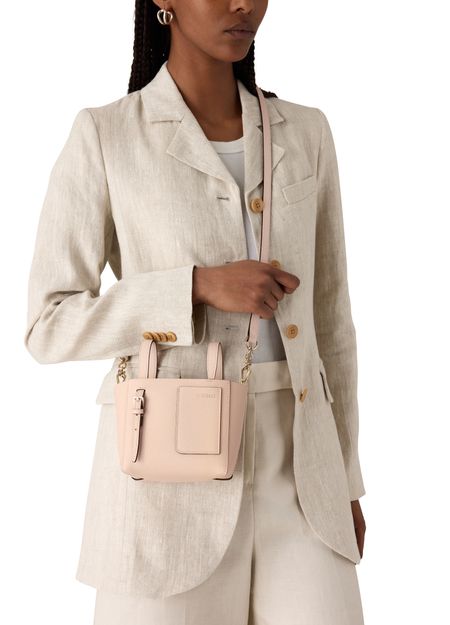 Genieße Valextras bucket bag micro aus genarbtem Leder mit gold-finish. Doppelgriffe und ein dünner, verstellbarer, abnehmbarer Trageriemen sorgen für flexible Tragemöglichkeiten. Sichtbare Nähte, ein großes Innenfach sowie Front- und Reißverschlusstasche vereinen Stil und Funktionalität.