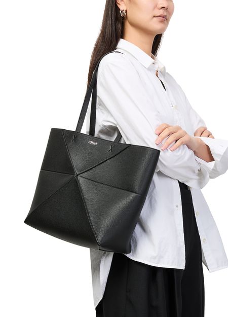 Genieße die Cabas-Tasche Puzzle Fold Mini aus weichem, genarbtem Leder von Loewe mit doppelgriffen und sichtbaren Nähten. Das großzügige Innenfach und das geprägte Logo auf der Vorderseite setzen stilvolle Akzente für einen modernen, urbanen Look.