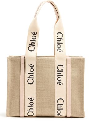 Die mit einer praktischen Innentasche ausgestattete Shopping Bag Woody vereint auf subtile Weise edle und natürliche Materialien sowie ein schlichtes und elegantes Design. Der Chloé-Schriftzug auf den breiten Henkeln schmückt den Umfang des ikonischen Modells.
