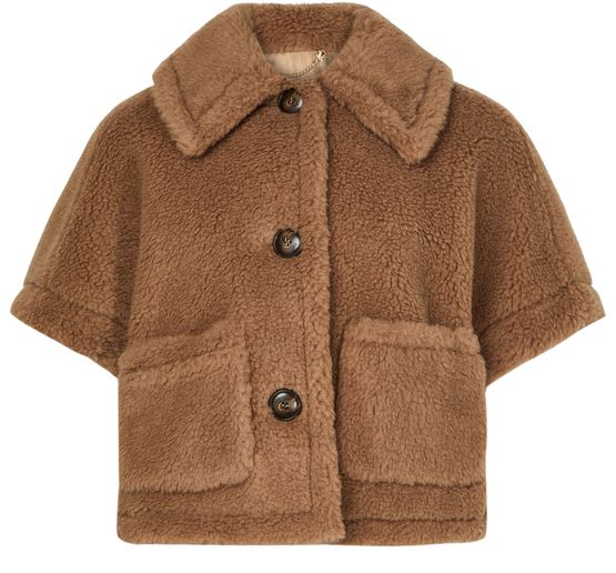 Erlebe Max Maras Cape aus Teddy-Stoff Newterzo, ein fesselndes Ensemble mit einem kurzen Schnitt und herabfallenden Ärmeln, das moderne Eleganz ausstrahlt. Dieses kurzärmelige Stück, mit exquisitem Pelzdetail, wird durch einen Knopfverschluss elegant abgerundet und ist eine wesentliche Ergänzung für jeden stilvollen Kleiderschrank.