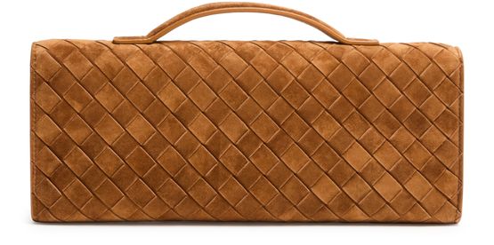 • Beschreibung : Clutch, intrecciato-flechttechnik, gepolstertes geflecht, einzelner griff, ledergriff, tragegriff, logo auf vorderseite, veloursleder, drehverschluss, goldfarbene schließe.