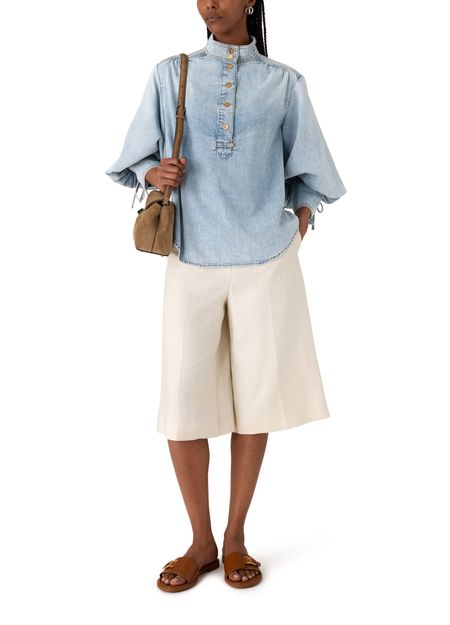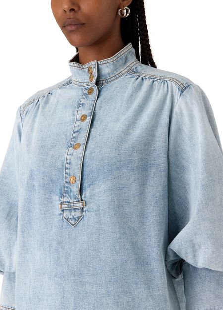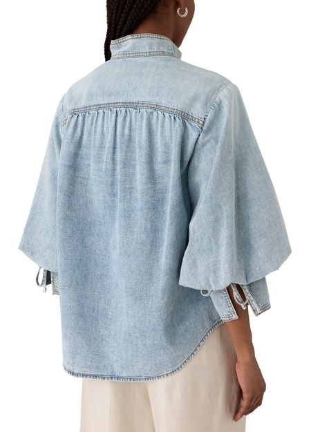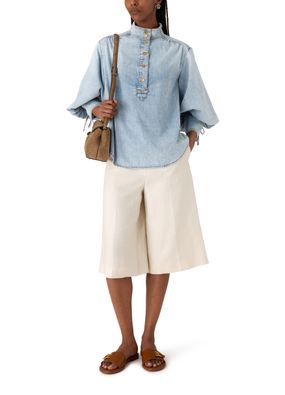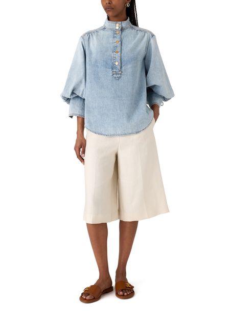 Erlebe die denimbluse von Zimmermann, gefertigt aus hochwertigem denim mit hochgeschlossenem Ausschnitt und dreiviertel-Ärmeln. Knöpfe auf der Vorderseite und kontrastnähte verleihen dem Look eine moderne Note – perfekt für vielseitige Outfits von Tag bis Abend.