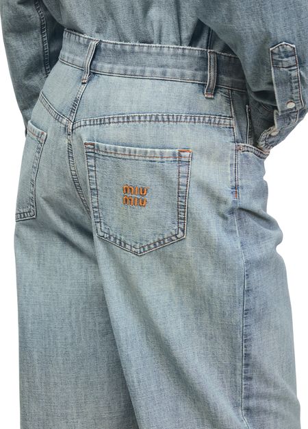 Genieße die Chambray Jeans von Miu Miu, gefertigt aus hochwertigem Denim und in moderner Knöchellänge. Reißverschluss mit Knopf, Gürtelschlaufen und sichtbare Nähte sorgen für einen stilvollen Look. Praktische Taschen und das dezente Logo auf der Rückseite machen sie zum vielseitigen Favoriten.