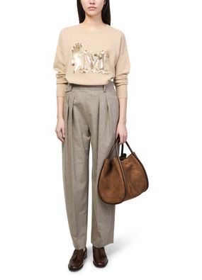 Genieße Max Mara Schultertasche aus Veloursleder mit breitem, einstellbarem Riemen für flexible Tragemöglichkeiten. Das goldfarbene Logo auf der Vorderseite und sichtbare Nähte setzen stilvolle Akzente, während ein großes Innenfach und ein Reißverschlussfach Funktionalität bieten.