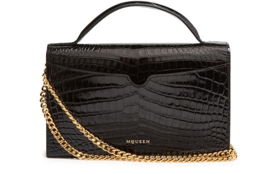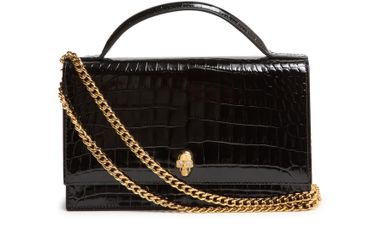 Genieße die Handtasche Skull Medium von Alexander McQueen, gefertigt aus leder mit krokodilprägung und markantem krokodildruck. Der goldene kettengurt, der bügelverschluss und das großzügige innenfach mit logo auf der vorderseite vereinen Stil und Funktionalität.