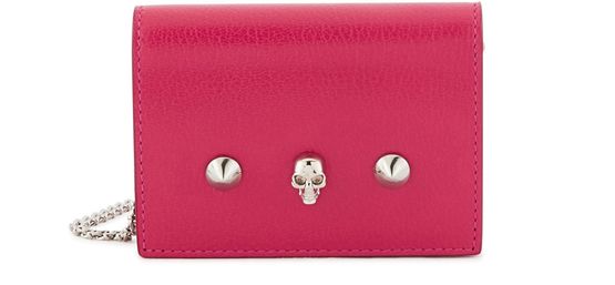Dieses moderne Kartenetui von Alexander McQueen lässt sich in eine Hosentasche oder Tasche stecken, kann aber dank seiner Metallkette auch elegant am Handgelenk getragen werden.