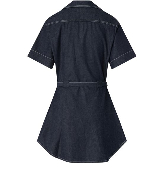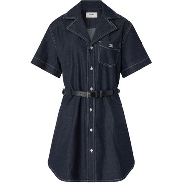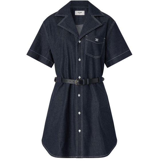 Entdecken Sie das Kleid aus Baumwoll-Denim, Triomphe besticktes Kleid von Celine, ein Schlüsselstück mit klassischem Schnitt und Mini-Länge. Offener Kragen und Brusttasche verleihen Charme.