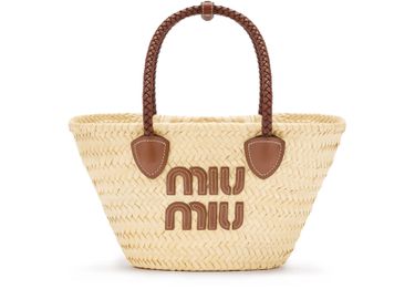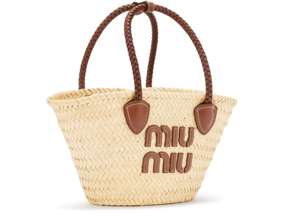Entdecke die kleine Cabas-Tasche aus Raffiabast von Miu Miu – eine stilvolle Neuinterpretation der klassischen Korbtasche. Doppelgriffe und ein dünner Trageriemen sorgen für Vielseitigkeit, während großes Innenfach, Innentasche und sichtbare Steppnähte Funktionalität bieten. Logoapplikation und Metallic-Finish runden das Design elegant ab.