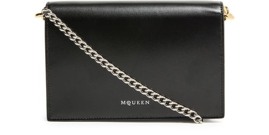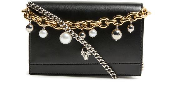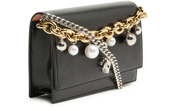 Genieße die kleine Tasche Skull von Alexander McQueen, gefertigt aus glattem Leder mit dekorativem, abnehmbarem Kettenriemen. Sichtbare Steppnähte, ein Logo auf der Vorderseite und ein Druckknopf-Verschluss vereinen stilvolle Details mit praktischer Raffinesse.