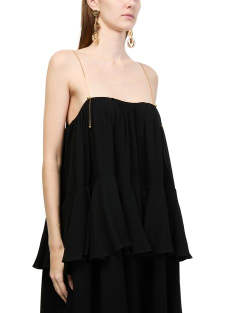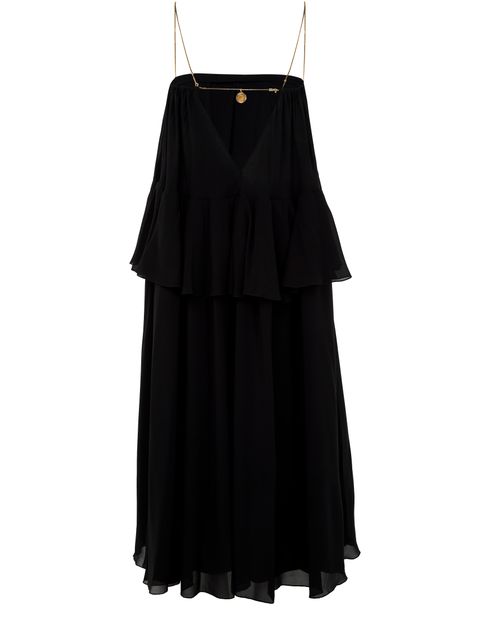 Genieße das langes kleid mit freier schulter von Chloe, das mit rüschendetails und zarten trägern begeistert. Der V-Ausschnitt am Rücken und das ärmellose Design verleihen dem Look eine moderne Note – perfekt für stilvolle Anlässe.