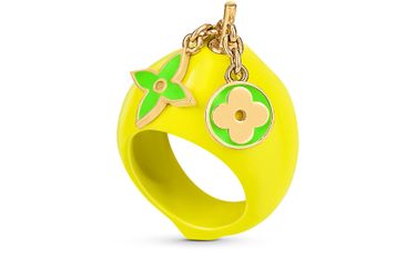 Dieser LV Fruits Ring ist eine perfekte Ergänzung zu einer Reihe an Kreationen mit dem verspielten Früchte-Thema dieser Saison. Er präsentiert sich in der Form einer von Hand mit Kristall-Strass besetzten Zitrone sowie mit Anhängern samt Monogram-Blüte. Ein modisches Schmuckstück mit einer verspielten Note.