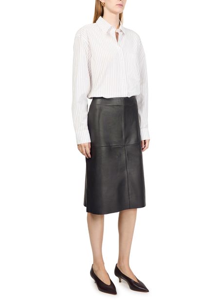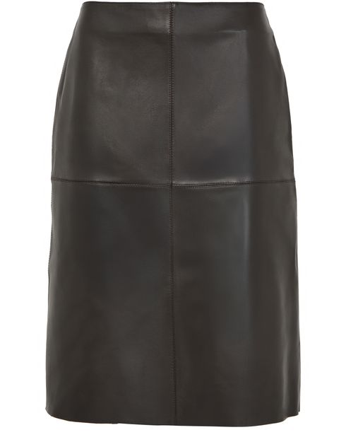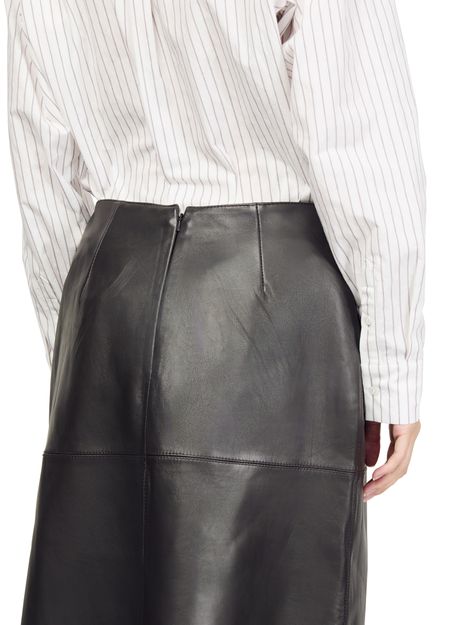 Erlebe Soeurs geraden Rock aus glattem Leder, das eine moderne, elegante Ausstrahlung verleiht. Seine knielänge und sichtbaren Nähte sorgen für eine schicke Silhouette. Der Reißverschluss am Rücken bietet Funktionalität und Komfort, was ihn zu einem vielseitigen Begleiter für jeden Anlass macht.