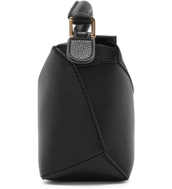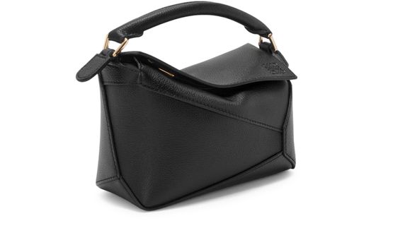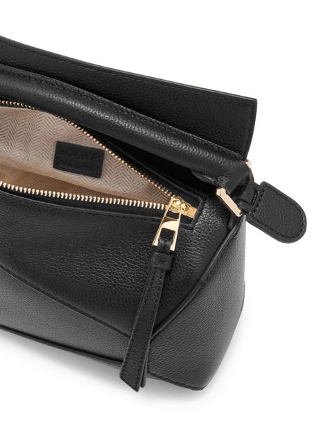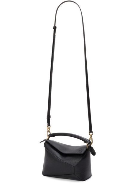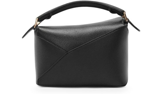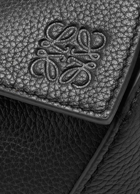 Erlebe Loewe's Minitasche Puzzle Edge mit einem eleganten Medaillon Anagram. Aus genarbtem Leder gefertigt, bietet sie einen einzelnen Griff und einen abnehmbaren Tragegurt. Der Reißverschluss und die sichtbaren Steppnähte betonen das Design, während das geprägte Logo und das Gold-Finish eine elegante Note verleihen.