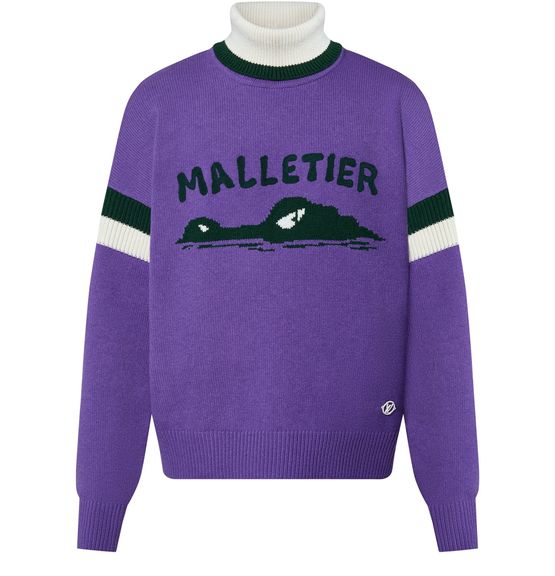 Der grob gestrickte Pullover aus Lammwolle mit überschnittenen Schultern präsentiert sich in einem dynamischen Farbton der Saison. Der Rollkragen und die beiden Streifen am Oberarm heben sich farblich ab. Zu den Details gehören eine Intarsie in Form eines Krokodils unter dem aufgestickten Wort „Malletier“ auf der Brust sowie die mit der Louis Vuitton Signatur im Bouclé-Finish bestickte Rückseite.