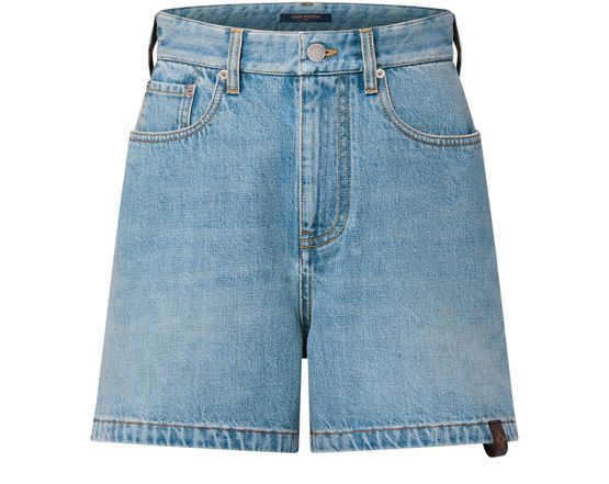 Diese gerade geschnittenen Shorts aus klassischem, mittelblauem Baumwoll-Denim präsentieren sich in einem zeitlosen, legeren Look. Auf der Rückseite verweisen Taschen mit verschiedenen Details subtil auf Schlaufen im Carpenter-Stil, wodurch ein dezentes Workwear-Flair entsteht. Ein Louis Vuitton Patch aus Leder an der Taille und eine Schlaufe mit Monogram-Blüte am linken Bein runden das Design auf unverkennbare Weise ab.