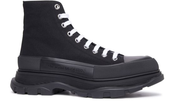 Die knöchelhohen Sneakers Tread Slick zeichnen sich durch eine dicke, gerippte Gummisohle und Schnürsenkel aus. Die Signatur des Hauses Alexander McQueen ist an der Seite und auf der Zunge erkennbar.