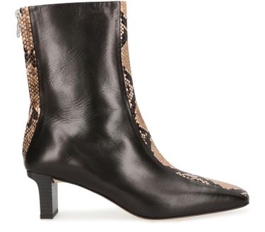 • Beschreibung : Stiefeletten, karree-Spitze, reißverschluss hinten, kontrastband an Schaft und Absatz, kalbsleder, dünner Blockabsatz, dünne Sohle.