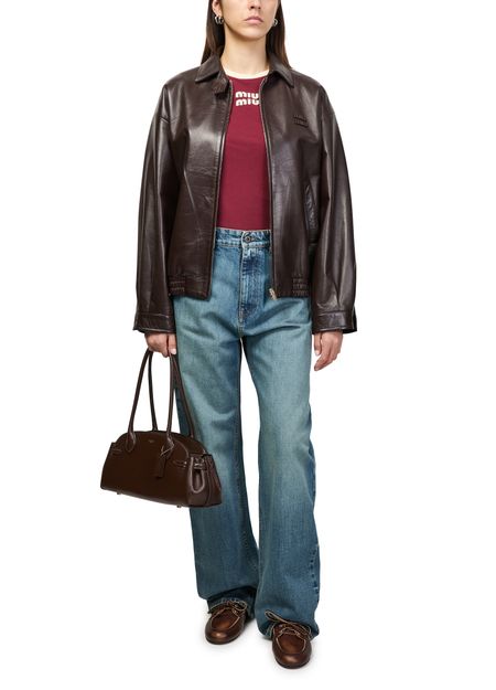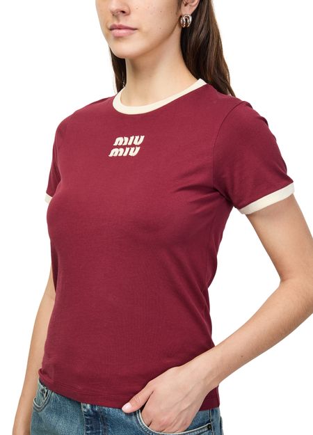 Entdecke das T-Shirt mit Logo von Miu Miu, veredelt durch ein gesticktes „Miu Miu“-Logo auf der Vorderseite. Der Rundhalsausschnitt und die kurzen Ärmel sorgen für einen modernen Look, der sich vielseitig zu Jeans oder Röcken kombinieren lässt.