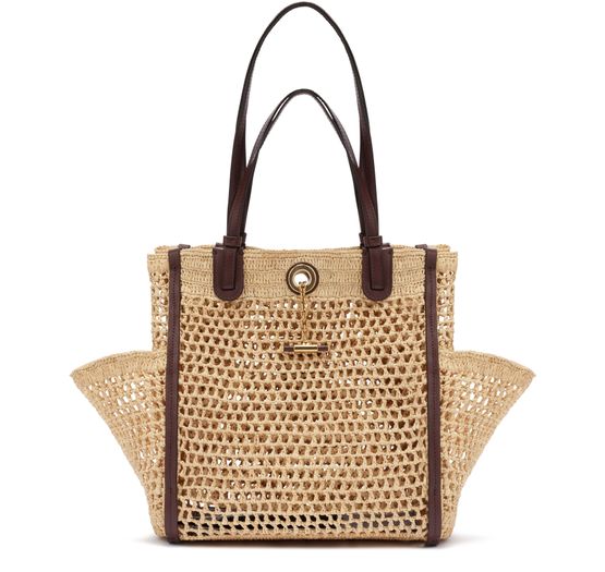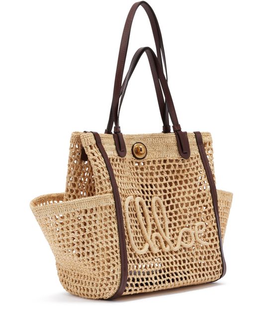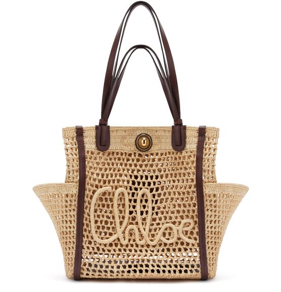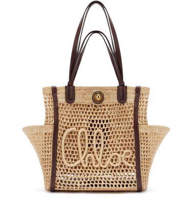 Erlebe die Tragetasche iconic von Chloé – ein Statement moderner Raffinesse. Durchbrochene Strickstruktur und Signatur-Sattelstiche prägen das Design, während Doppelgriffe und verdrehte Details stilvolle Akzente setzen. Großes Innenfach, Außentaschen und ein Logo auf der Vorderseite runden das metallic-finish ab.